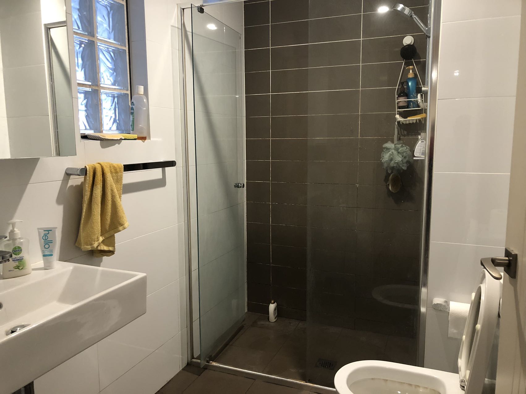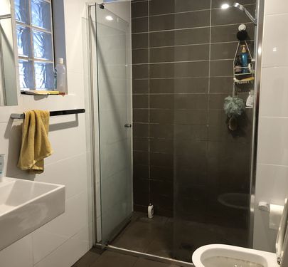 • Stylish bathroom with floor-to-ceiling tiles, mirrored cabinetry and internal laundry