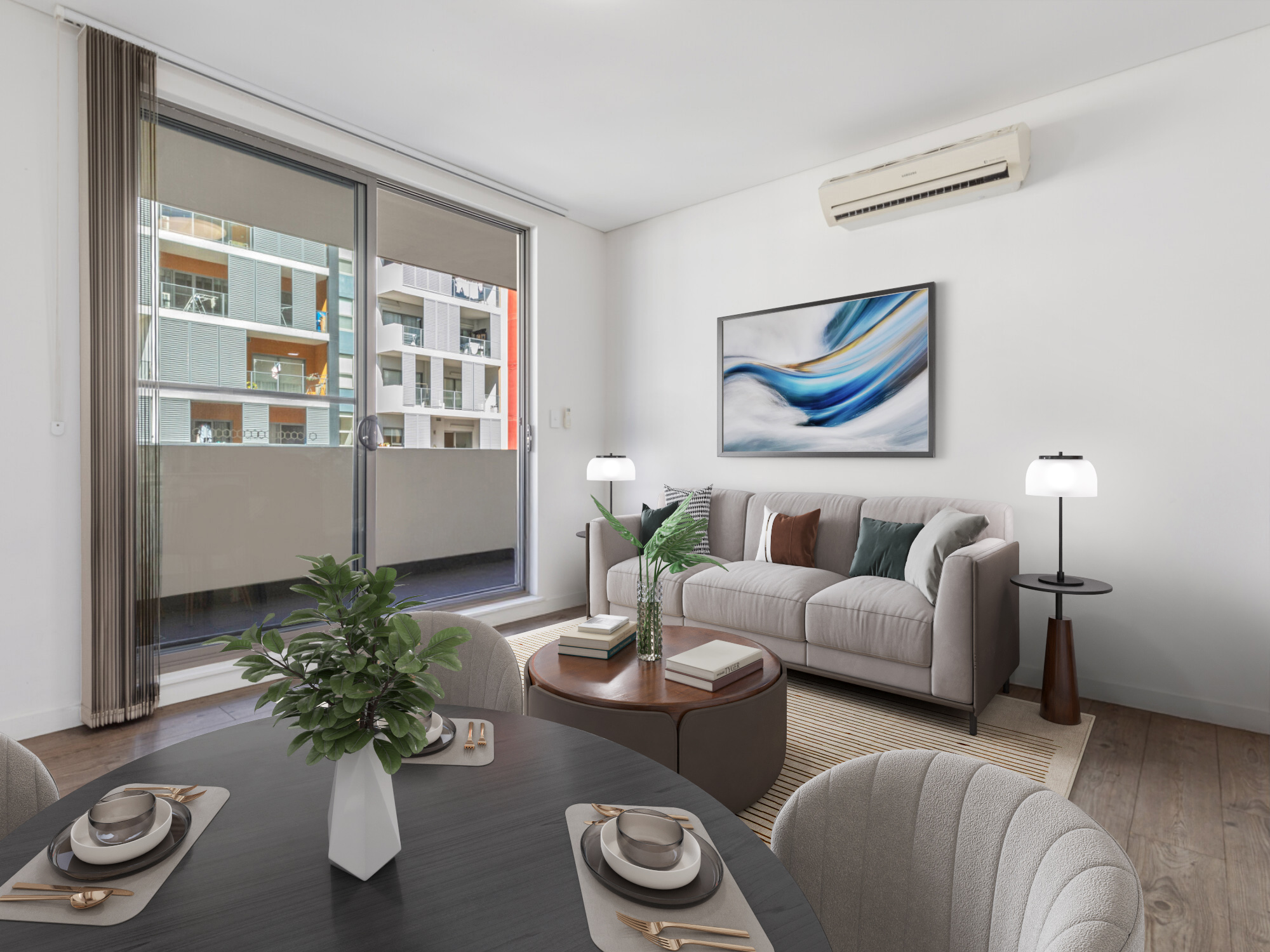 -Spacious dining and living room with timber floorboard throughout leading to huge wrap around balcony overlooking beautiful open view