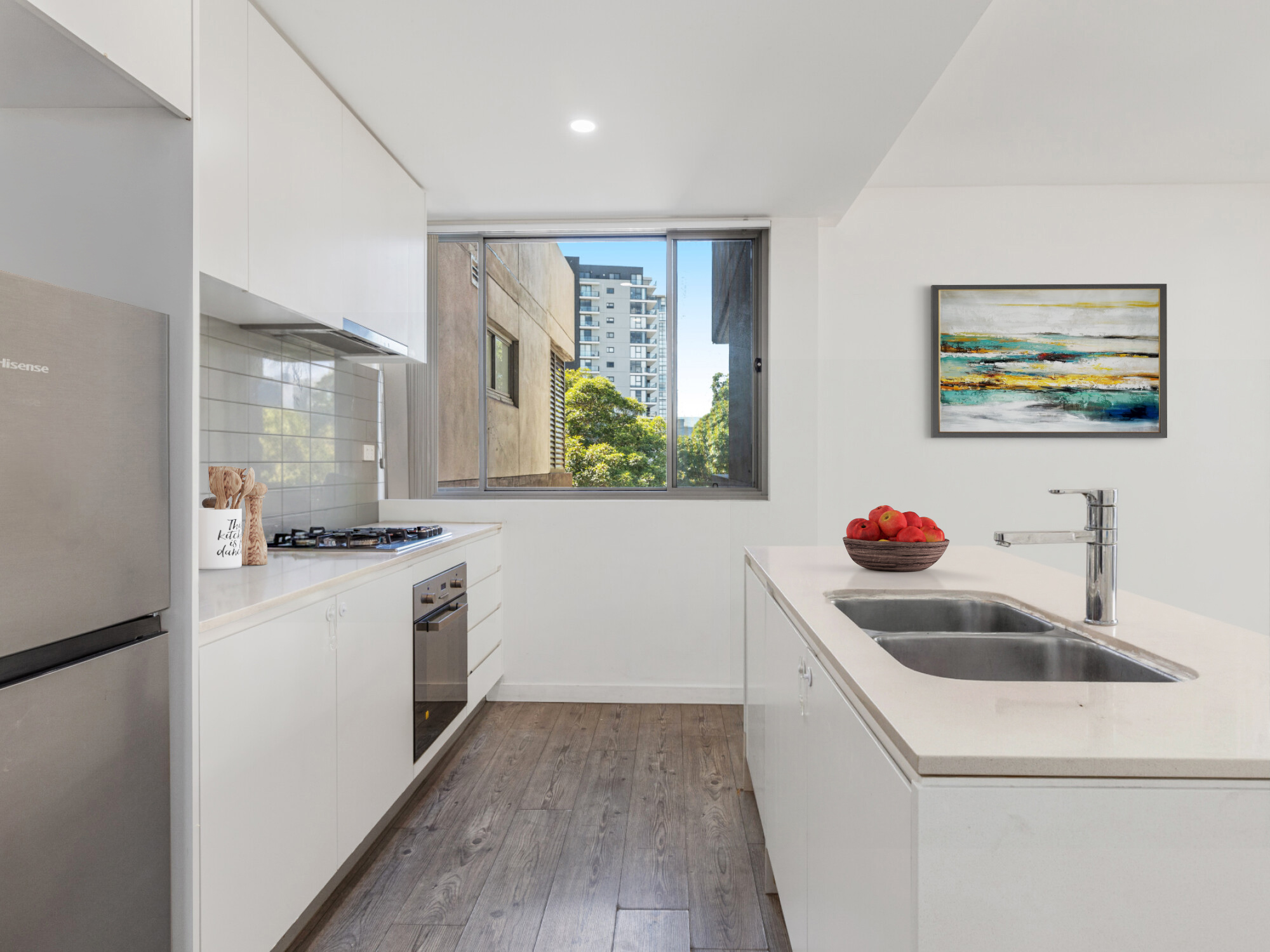 -Gourmet kitchen with stone benchtop, quality stainless steel appliances. Gas cooking