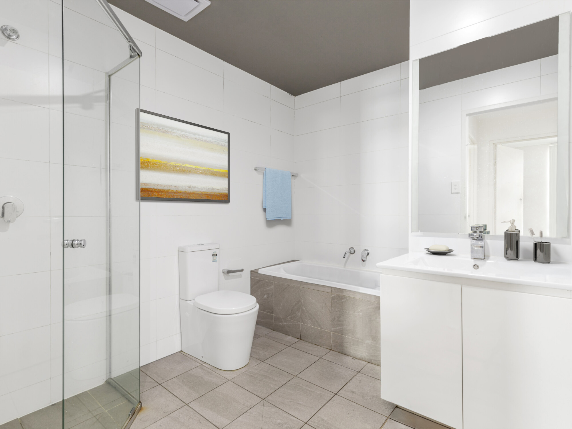 -Elegant bathroom with floor to ceiling tiles